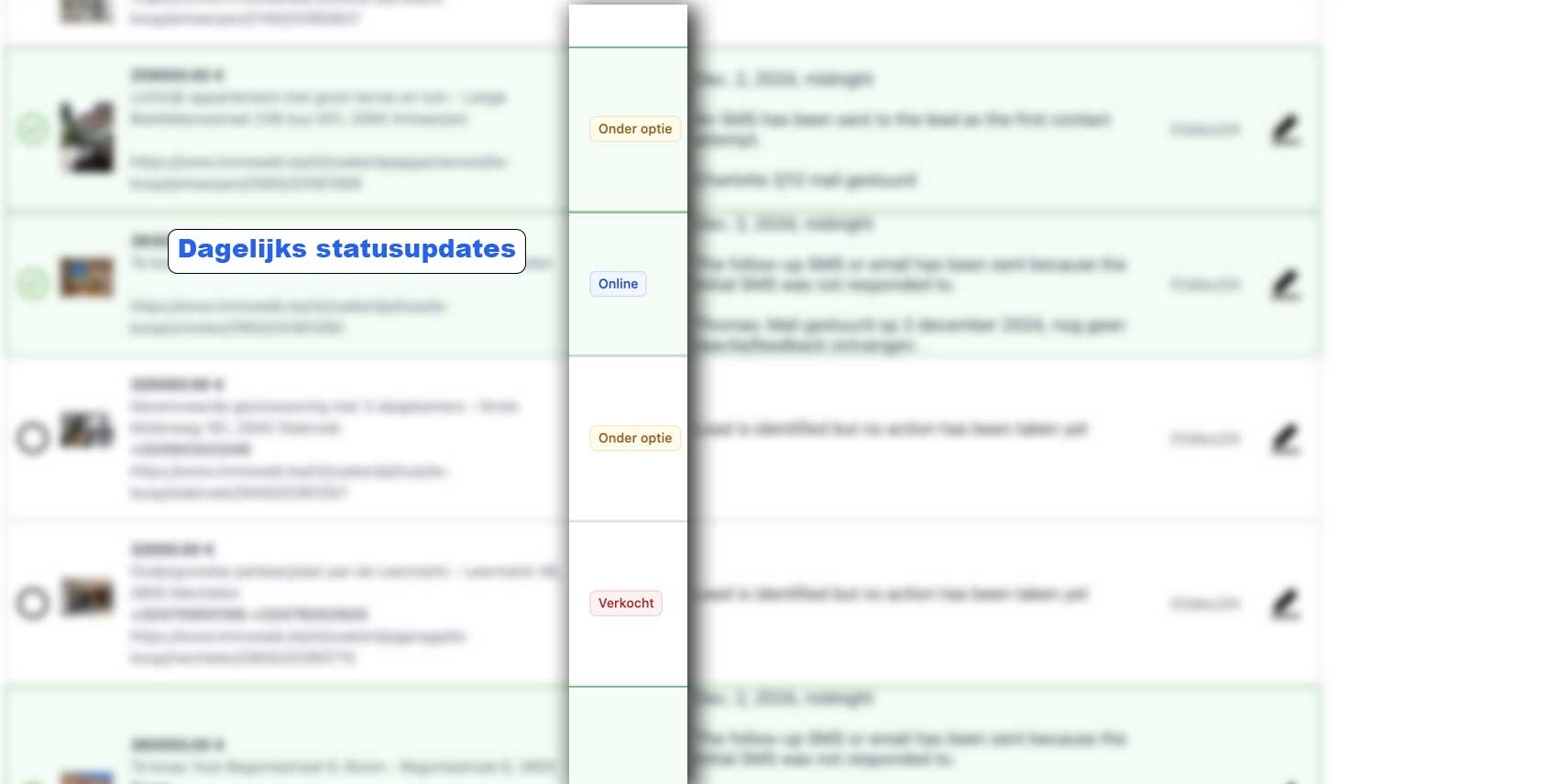 Met het Advanced-pakket is volledige automatisering van leadopvolging mogelijk. Dit omvat automatische SMS meldingen, waardoor u geen enkele lead mist en tijd bespaart. Neem contact op met onze support om dit in te stellen.